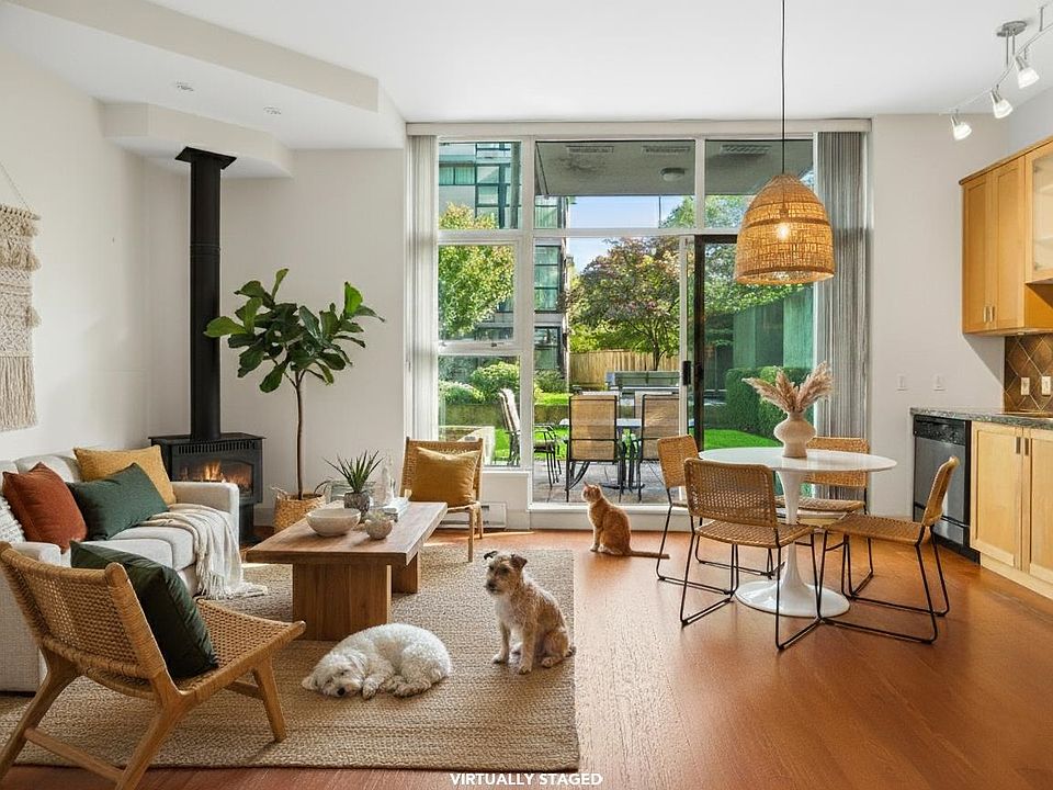 ATTN PET LOVERS! This super pet-friendly building allows up to three small dogs or two large dogs or three cats. The open concept features a half wall between the living area and the bedroom area which, combined with the high ceilings, creates an expansive feel. The living area has a freestanding gas fireplace with sliding doors to a 131 sq. ft. patio situated in the secure inner courtyard of the complex. The kitchen has space for a dining table, lots of cabinet space, stainless steel appliances and gas range. The unit features a walk-in closet, a small den/storage area, plus in-suite laundry. Building also has a large exercise room. Close to great shops in Marpole and Cambie Skytrain. Parking / storage.