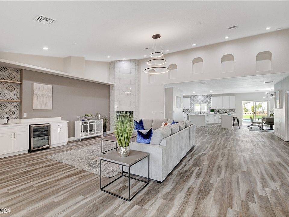 Rare property on a large lot tallying over an acre. This renovated home features dual suites, a large kitchen for hosting with an oversized pantry, a large living room area and a 3 car garage. The backyard features heated pool and spa, end to end covered patio, a large turfed area, a fire pit area, a renovated barn with A/C for more recreation. In addition, there is a separate casita suite with its own laundry and full kitchen and living area. Conveniently located to nearby shopping, Allegiant Stadium, The Strip and Harry Reid Airport.