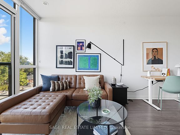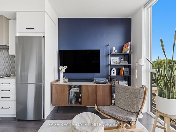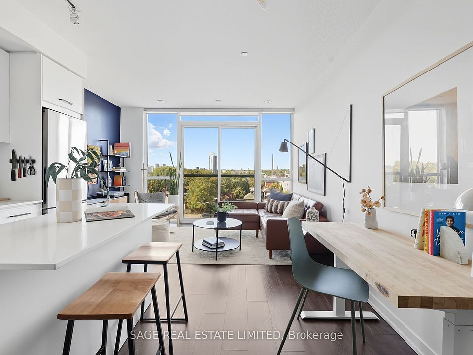 Your Private Retreat Above the Energy of Queen Street. Life at the corner of Queen and Logan is always buzzing, but inside Unit 605 you'll find calm, comfort, and a layout that makes sense. This 611-square-foot, 1-bedroom, 1-bath home was designed to feel welcoming and livable, never like a downtown shoebox. The entryway separates the bathroom from the living area, the kitchen sits at the centre of the unit for cooking and gathering, and the bedroom offers a quiet retreat away from street activity. High ceilings and natural light make the space feel open and airy, while the top-floor location adds privacy along with sweeping north-facing views over treetops and the neighbourhood. From here, you'll catch glowing sunsets and a unique cross-section of the city that feels both vibrant and peaceful. A custom kitchen island doubles your counter space and storage, perfect for dinner prep or casual drinks with friends. The in-unit storage locker makes it easy to tuck away skis, camping gear, and all the seasonal extras Toronto life requires. The building itself is equally thoughtful. Host rooftop dinners under the city lights, enjoy a spotless gym, fire up the BBQ terraces, or take advantage of the dog wash after a park visit. Parcel lockers, bike storage, and attentive management keep day-to-day living seamless, while the community lounge and engaged board foster a true sense of connection among neighbours. Step outside and you are in the heart of Leslieville. Morning coffee at Isle of Coffee, dinner at Lake Inez, tacos at El Hijo de Tizoc, or a pint at Black Lab or Avling, all just minutes away. Stock your fridge at Rowe Farms or Farm Boy, stretch your legs at Jimmy Simpson Park, or bike to Woodbine Beach. Downtown is only 15 minutes by streetcar or bike, though the neighbourhood vibe makes it hard to leave. Unit 605 is a peaceful city home that balances lifestyle, convenience, and comfort.