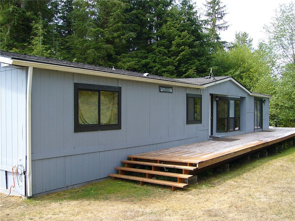 Newer Double Wide overlooking the Sol Duc River. Easy access for the would be fisherperson from the front deck to the river. Home has nice interior features. Lot is large enough for extra buildings and garden-fruit tree area's. Elevated River view