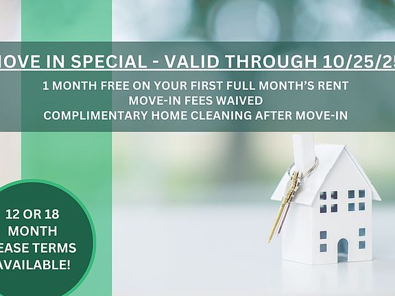 - Special offer! SIGN A 12 OR 18 MONTH LEASE FOR AMAZING MOVE-IN INCENTIVES! 1 Month FREE on your first full month's rent; Move-In Fees WAIVED; Complimentary Home Cleaning after move-in