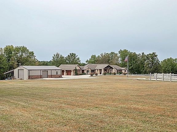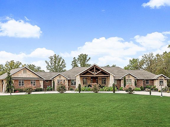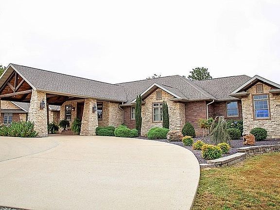 Beautiful One-Of-A-Kind Estate located in the Ozarks of South Central Missouri on 20 m/l Acres. Home offering over 5400 Sq Ft. Built in 2009 this Custom Brick and Stone home with circular drive and covered entry is professionally landscaped with professional exterior accent lighting, a large deck on the back of the home, private master bedroom deck and covered patio area from walk-out basement. Entering the home you will find custom tile work, wood floors brought in from Vermont, large living area with cathedral ceilings & custom timber beams, fireplace and large windows leading to the main outdoor living space. There are 3 bedrooms and 3 full baths on the main level and 3 bedrooms and two full baths on the lower level. The large kitchen with breakfast area includes an oversized island