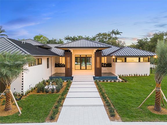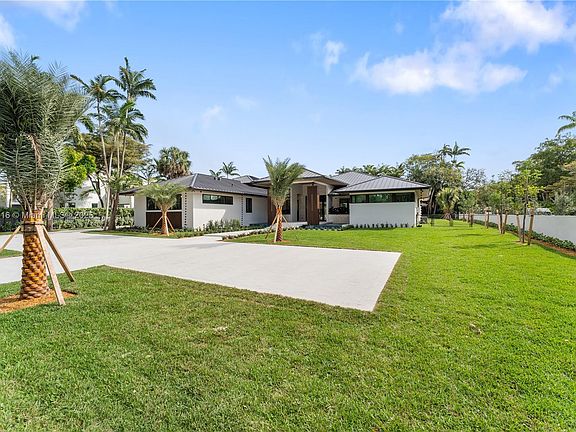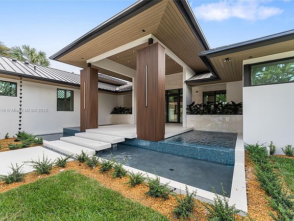 Discover the epitome of Miami luxury living w/ this impeccably crafted residence. This brand-new custom-built home sits on a 30,358 sqft lot that is completely secluded and on a private street. As you approach the home, you'll be greeted by a stunning entryway featuring floating steps that lead you to the front door. On either side of these steps, serene waterfall ponds cascade gently, creating a peaceful ambiance. This 5 bedroom 6 and 1/2 bath home will offer a total of 7,359 sqft. Features include a metal roof, ensuite baths, exquisite tile, custom Italian cabinetry, covered terrace for indoor and outdoor entertaining, pickleball/basketball court, outdoor gazebo with built in kitchen with cascading waterfall bar, and more.