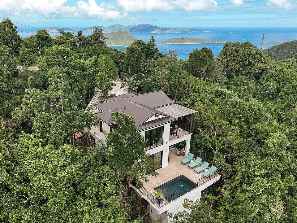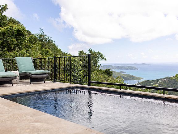 SAPPHIRE PEAK is a charming, well built masonry home perched high on Mamey Peak with postcard worthy views over Bordeaux Mountain, Coral Bay Harbor, & the BVIs. This inviting villa features two spacious king suites, elegant baths, a fully equipped kitchen with modern appliances, & travertine tile throughout. The private pool & sun filled deck offer a serene retreat, enhanced by terraced landscaping & a brick path to a viewing area with sweeping vistas. This space also provides room for an additional build if desired. Fully air conditioned & in a successful short term rental program, the home is move in ready & just a five minute drive to the North Shore beaches. Designer furnishings & thoughtful decor make Sapphire Peak picture perfect for island living or continued rental success.