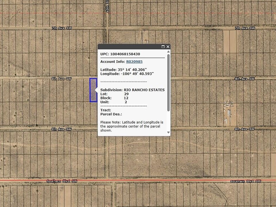 Super easy access to this 1/2 acre lot in Rio Rancho Estates. Only 2 blocks and one lot away from Electricity on Southern Blvd. Come and enjoy the peace of the west mesa in Rio Rancho. This property is the perfect investment for the person or people who wish to get away or just wish to invest before the prices go up.
