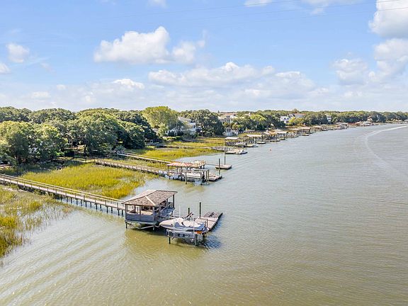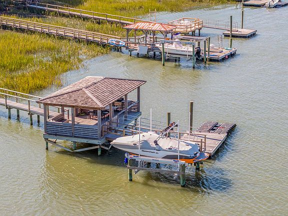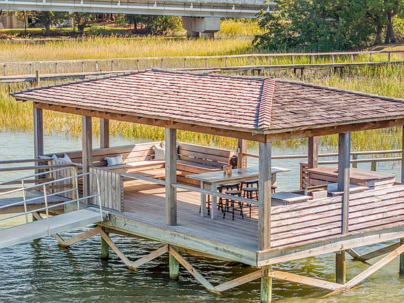 Welcome to 9 13th Ave, a true boaters paradise with incredible DEEPWATER access from one of the largest docks on Isle of Palms! At 15x30 ft, this spacious ipe dock is an extremely rare find. The enormous covered pierhead is an entertainer's dream, with a dining area, a built-in seating area, as well as a prep sink and counter space. This dream set-up takes dock life to the next level! There is also a 12,000lb boat lift, floating dock, space for jet-skis or a second watercraft, and dual railing catwalk for easy boat access. With at least 7' at low tide, this is truly the ultimate water-sport lovers low country dream! The contemporary style home was completely renovated in 2020, and the chic and sophisticated vibe achieved is the epitome of elevated mid-century modern.From the moment you step through the front door you are drawn to the stunning marsh views from the floor to ceiling glass in the main living spaces. High quality wood features are showcased throughout. The oak cabinetry creates a warm and inviting, yet perfectly modern kitchen. The living room boasts a soaring cathedral ceiling with tongue and groove oak, white shiplap walls, and vintage mid-century fireplace. Two guest bedrooms share a hall bathroom, and the large primary suite has lovely views of the water, a large spa-like bathroom and dual closets. The large screened in porch is a relaxing haven from which to soak up the views, watch the marsh birds and boats going by, and also has plenty of space for excellent entertaining! Additional outdoor space on the back patio leads to the private gated dock. Unique features include a wood paneled bonus room that functions as an office or gym, with a whimsical climbing wall and ladder to climb up to a fun lofted room for children! There is also a very practical and spacious laundry/utility room with tons of storage, as well as an outdoor storage room in the carport. This home is tucked away on a private lot and is a secluded refuge, yet it is easy walking distance to the sandy beach and all the dining, shopping, and entertainment of front beach IOP! Easy access to the IOP connector provides a quick way on and off the island to Mt. Pleasant and downtown Charleston. This home is being sold completely furnished!