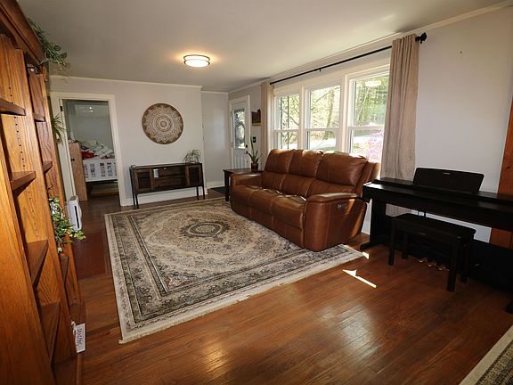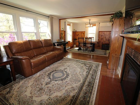 IT'S A GEM! Just starting out or want to downsize? Here's the perfect house. This ranch style home affords easy, one floor living or additional living space in the mostly finished lower level. Come in from the deck and you'll find a spacious heated porch or mudroom. The kitchen has wooden cabinets with unique slid-out drawers and stove, refrigerator and dishwasher. Going toward the front of the house you'll find a charming, knotty pine dining area with built-in hutch opening to the fireplaced living room. There are two bedrooms and a recently re-done full bath. Go downstairs and you're in a walk-out basement family room with built-in shelves and a pellet stove. Next to this is a garage. The large utility room comes with a washer and dryer and neat original metal cabinets - mid-century for sure. Another finished room with walk-in closet is ideal for in-home office and gym or just about anything else. New roof and three mini splits have been added by this owner.