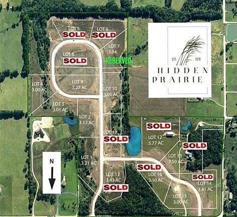 Lot 9 3.27+/-acres Reserve your lot today and build your dream home. HIDDEN PRAIRIE, a planned development that includes walking trails, private lake & future shelter. Secluded rural setting w/trees, beautiful sunrises and sunsets. Exclusive, spacious acreage lots w/ over 30% natural conservation space, within minutes of the city. Only SEVEN remaining picturesque lots available. Bring your builder or consult with the listing agent to build your dream home. Easy access to I-35 highway. Outbuildings are allowed.