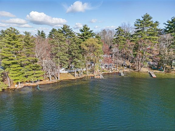 Welcome to Little Alum’s Own Sunset Strip, Where Evenings End in Gold. Tucked along one of the most coveted stretches of shoreline, this spectacular legacy property boasts 180 feet of level, pristine frontage on one of New England’s cleanest, fully recreational lakes. Set on an expansive 1.66-acre lot, this entertainer's dream home offers an inviting beach area, two docks for boating enthusiasts, and an oversized custom-built two-car garage with walk-up storage, ideal for future expansion. Step inside and experience a contemporary home designed for seamless indoor-outdoor living, with an open layout that maximizes the mesmerizing lake views throughout. The updated kitchen features tile flooring, granite countertops, and modern appliances, flowing effortlessly into a charming dining area with custom built-ins.The living room steals the show with soaring vaulted ceilings, a dramatic floor-to-ceiling marble fireplace, and walls of windows that frame stunning panoramic views of the water.