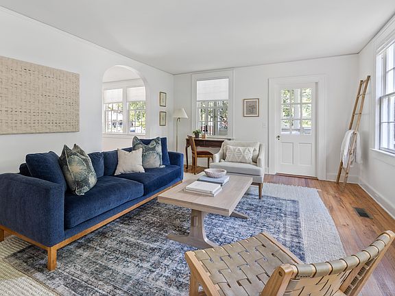 Enter the home to a large open living room with comfy couches and a smart TV ready for you to log in to all your favorite streaming services. There is also a dedicated workspace that looks out onto the sunroom. The tiled sunroom off of the living room gets amazing light all day long and has a door for privacy - a daybed can sleep an extra guest or serve as the perfect remote work or reading spot. The large eat in kitchen has a 90" kitchen island (also great for working) and dining table that seats 6. The kitchen is fully stocked and features new stainless steel appliances and a gas stove. Off of the kitchen is a large porch area with a cafe table and seating for six, for truly delightful morning coffees and porch sitting under an old oak.
