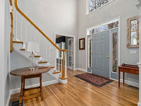 Transcend the long driveway to this beautiful home offering a perfect combination of a neighborhood setting but with 1.75 acres of privacy. A gorgeous recent kitchen with oversized island offers seating for 5 and an abundance of workspace. Custom cabinets, electric induction cooktop/ double ovens with micro/convection options, vented hood, farmers style sink and under cabinet lighting are among the features. The second floor is open with a loft that circles the cathedral family room. A laundry room includes built-in ironing board. All bedrooms have cathedral ceilings. The primary suite, complete with sumptuous bath including a river-rock/tile steam shower and soaking tub. Three pristine levels of living including 2 private offices for those working from home, living room with built-in bar area, dining room with access to the 3 season sunroom and deck. The lower level offers bedroom/exercise room and a 3/4 bath! All of this in a town offering award winning schools and highway access!