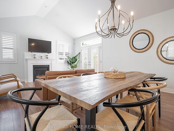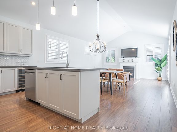 Cathedral ceiling in kitchenUpgraded cabinetryQuartz countersWine fridgePendant lightingGas fireplaceSeating area