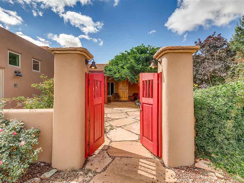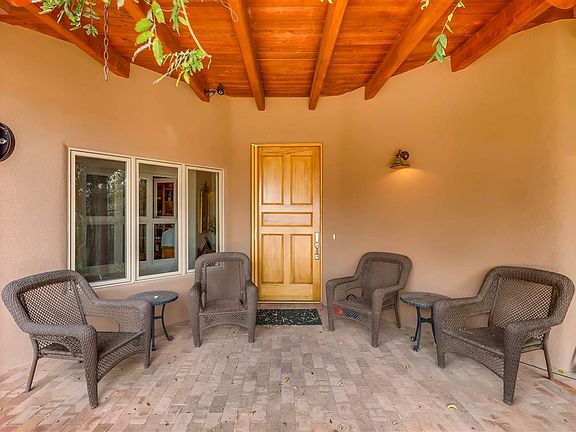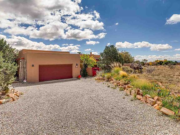 This lovely Rastra built home is a perfect blend of Santa Fe contemporary pueblo design with Italian Tuscan detailing. Lofty foyer with lighted nichos lead into grand great room. A Rumford style fireplace adds warmth and vigas span both the living room and formal dining area. A long portal bordered by lush landscaping and thick straw bale wall adds privacy to outside entertaining enjoyment. Good separation between the guest wing, office and owner's suite. Energy efficient with roof mounted active solar assist to heating and electric. Re roofed and remodeled in 2012, incredible view roof deck added plus large heated attached studio. This home is stunning! Close to Eldorado and local amenities only minutes into Santa Fe.