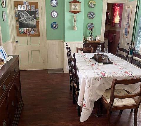 This spacious home has 3-4 bedrooms, large living room, country style kitchen , double dining room and half bath on the first floor along with an enclosed rear porch and wrap around front porch. The second floor has three good sized bedroom, a full bath and access to a walk up attic and storage room. The home has vinyl siding and windows for low maintenance. The highlight is the two plus car garage with two doors facing the road and another addition that you can access from the side to store up to three vehicles or have a great workshop. The source of all representations are from the seller or a public source; broker has not verified same. It is recommended that buyer independently verify all information.