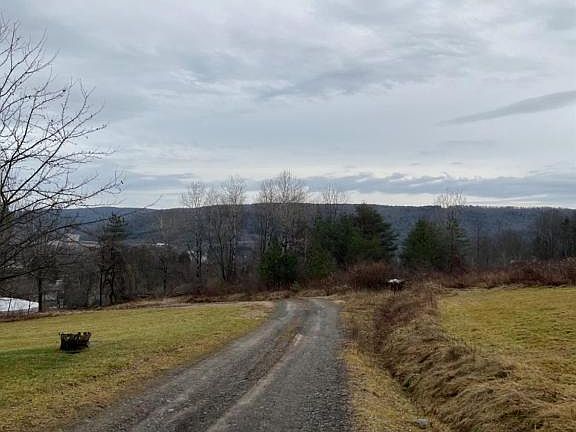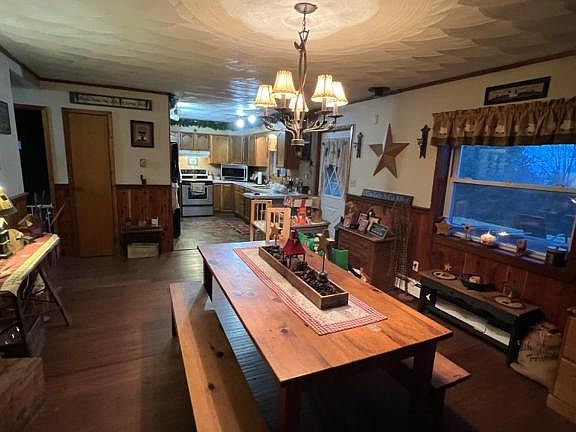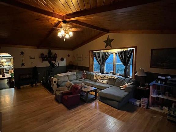 Just outside of town, this Ranch Style home is tucked away at the end of a dead end road. Very Private with a great view. Over 5 acres with a lot of wildlife, great for outdoor enthusiasts and hunters. The barn style garage is set up for goats at the top, with a ramp leading to fencing. The bottom part is connected to a chicken coop. The back part of the house, where you first walk in, is a nice mudroom with wood stove, that hasn't quite been finished, and needs some work. There is also a laundry room, that could easily be turned into a bathroom as well, and an office room, with its own exit. When you enter you'll notice beautifully done ceilings, and nice wood floors. The kitchen has a pantry and extra counter space. The dining room is very large, with beautiful wood trim and floors. There is a door that leads to the front patio area in the dining room as well. From the dining room you can enter the living room. The living room was an addition, and was beautifully done. Very large and spacious with tremendous wood beams, ceiling fan, bay window, and a door leading to the side porch. There are two decent sized bedrooms, and a nice large Main bedroom with a full bathroom next to it.
