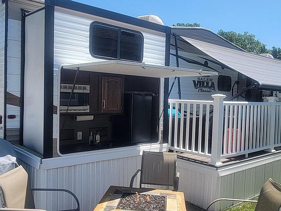 Located in the desirable Wells Moody area, this 2017 Forest River Salem Villa Classic offers comfort, convenience and coastal charm. This home-away-from-home features four slides-outs and generous outdoor living spaces including: A 7'x12'deck with awning and patio seating. An 8'x11' stone patio with gas firepit. An outdoor bar with sink, mini refrigerator, and microwave.