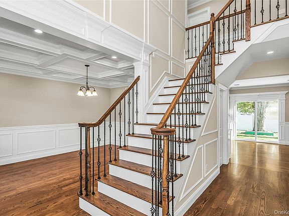 Brand New Construction located in the heart of Hicksville, near shopping, dining, transportation and schools. True Center Hall Colonial with 5 spacious bedrooms, 4.5 baths and 1.5 car garage. Oversized guest bedroom and full bath located on the first floor make an ideal living space or bedroom on the first floor. Open concept layout with a gourmet chef's kitchen features high-end stainless steel appliances, double cabinetry to the ceiling and an oversized center island. Sun drenched living room, coffered ceiling in the dining room and elegant millwork throughout the entire house. Junior suite with full bath located on 2nd floor. Primary bedroom with tray ceiling showcases a grand walk-in closet and spa-like primary bathroom. Unfinished full basement with separate outside entrance offers endless possibilities for customization. Fully white vinyl fenced property with in-ground sprinklers and backyard patio perfect for entertaining.