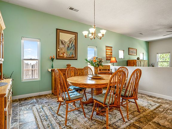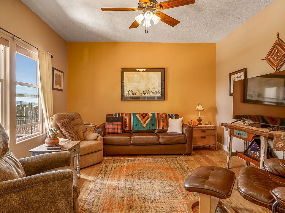 Discover this charming Pueblo style, single-level home boasting 3 bedrooms and 2 baths with a media/bonus room/office and featuring an expansive backyard with views. Constructed in 2017 and meticulously maintained, the property exudes warmth and care. A beautifully landscaped front yard enhances its curb appeal, welcoming visitors upon arrival.  Inside, the home offers a spacious layout where the dining room, kitchen, and living room seamlessly flow together, all overlooking the backyard oasis complete with a covered portal and serene fish pond.  A media/bonus room/office at the front of the home adds plenty of flex space. The generously sized primary bedroom suite includes its own backyard access, providing a private retreat. Two additional guest rooms and a second bath complete the comfortable interior living space. Conveniently, a oversized 2-car garage is also included, ensuring ample parking and storage. The area directly opposite the front of the property is designated as open space, preserving the habitat for local wildlife and offering stunning views of Santa Fe sunsets from the front porch. Don't miss the opportunity to view this well-cared-for home that combines modern comfort with scenic outdoor living.
