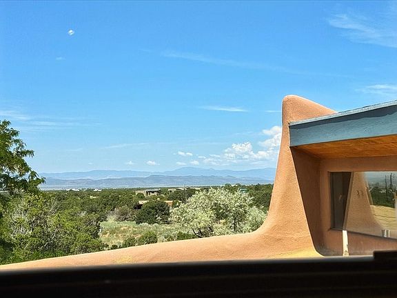 A rare gem in Sunlit Hills and it can be all yours! Enjoy the beautiful feel of 5 acres of "old Santa Fe rancho" living with gorgeous views of the Jemez mountains, yet an easy drive to downtown! Serenity abounds; views of the mature trees and grounds from every room in the house. This solar property consists of a main house, guest house/casita and two stucco storage buildings. Both house and guest house are mostly adobe construction which creates that special feeling of solidity we all love. The portals/verandas and patio areas invite us to an indoor/outdoor lifestyle among beautifully developed and mature gardens. Fabulous house for entertaining! One acre surrounding the house is fenced in for pet security. There is a corral and up to 4 horses are allowed. The main house has 2 living areas with fireplaces, a great working kitchen with top tier appliances, 2 bedrooms, an office and a laundry room / pantry. The main bedroom suite is on the ground floor, the second bedroom suite, currently used as an artist’s studio, is upstairs. Great storage and closet spaces throughout the house. The charming guest house is fully self-sufficient with a living area, bedroom, dining area with banco, kitchen, bathroom, on-demand hot water heater w/d hookup, portal and a beautiful private garden. Other features include: vigas throughout, hot tub off the primary bedroom, air conditioning, in-floor radiant heat, community water, black water irrigation, gated entrance and security system. No HOA.