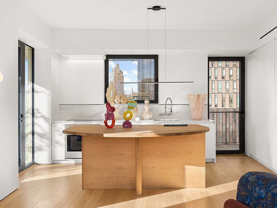 The kitchen centers around an oversized butcher-block island that invites conversation and creativity, while honed white-marble countertops and Bosch appliances—including an integrated refrigerator, induction cooktop, and wall oven—combine sculptural beauty with effortless function.
