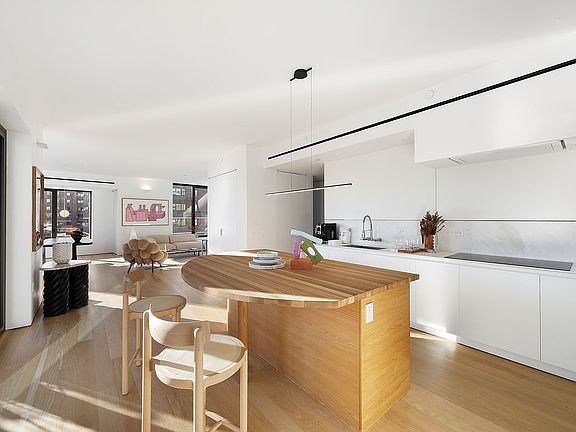 Penthouse B is a full floor, 1,969 SF three bedroom home offering north, south, east, and west exposures, a private entry landing, and four covered loggias. The loggias are framed by a beautiful perforated screen, which allows light to filter in aand provides added privacy making it a true extension of the interior. The expansive great room allows for a large dining table, and generous corner living room. The massive kitchen features a gorgeous organically shaped island functioning as an additional gathering space, and faces a wall of glass overlooking the south facing loggia and neighboring Cathedral. The gracious primary suite features a wall of closets, corner exposure, and a magnificent en-suite bath with dual sinks, and a massive walk in shower with direct access to another loggia. Off a wide gallery, the additional bedrooms have corner exposure and share a windowed bathroom with white glass mosaic tile and dual sinks, and there is access to another south facing loggia and planted terrace.