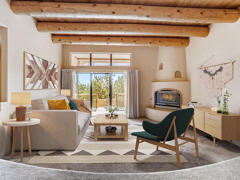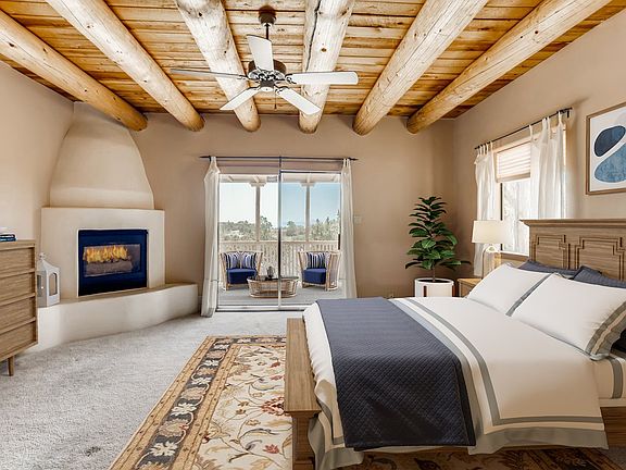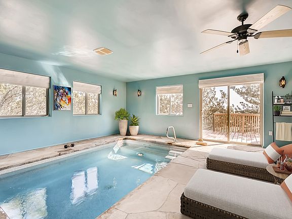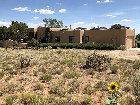 Eldorado's beautuful night skies, sunrises, sunsets & mountian views enhance this custom designed home surrounded by an abundance of mature trees with an added feature of an enclosed heated therapeutic pool/exercise room. Flexiblle 2780 sqft. 3 bedroom 3 bath floorplan with Santa Fe detailing on a 1.5 acre lot overlooking a south facing "greenbelt." Nice sized kitchen with adjoining dining & breakfast rooms, separate & spacious living & family rooms with fireplaces & viga ceilings. There is even office space! A private walled yard features several view decks to relax & entertain on, all overlooking the "greenbelt." Additional features inclulde active solar for little or no electric bills (with PNM credits), central gas forced air heat & evaporative cooling, 2-car garage with shelving. Centrallly located on chipped sealed (paved) Chusco Rd. between The Agora & La Tienda shopping centers, school, library, senior center, and Eldorado's Community Center with its many amenities.