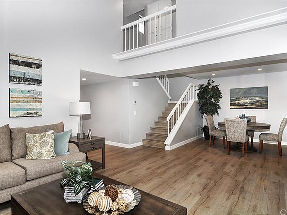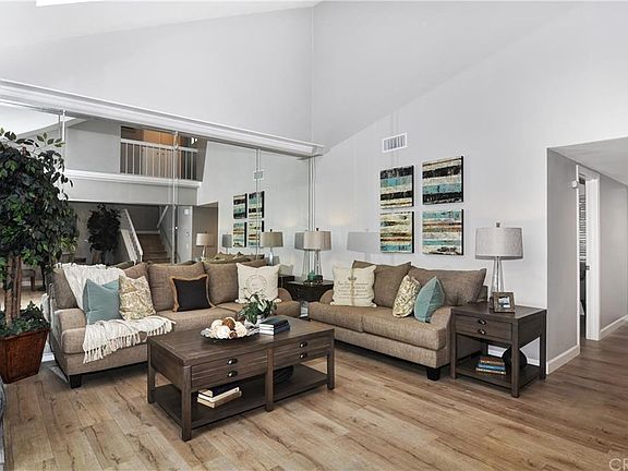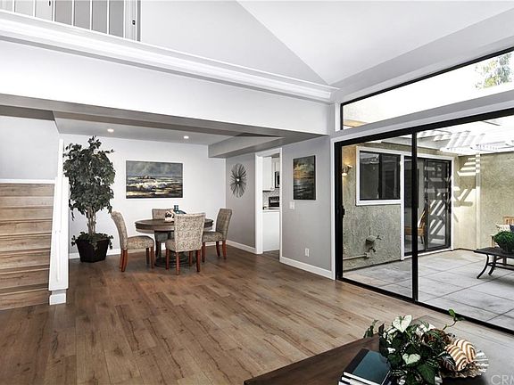 Almost completely remodeled four years ago, this light and bright Bordeaux townhome has preferred "Inside the Loop" location in Woodbridge. The 2-story redesign features 3 bedrooms and 3 full baths in approx. 1,600 s.f. Beyond a gated entry porch, the beach modern themed residence showcases a main floor bedroom and bath, spacious living room with smooth vaulted ceilings that flows into the dining room, a skylight, access to a private atrium, a mirrored wall, and an upgraded stacked-stone fireplace. Designer style paint, wood-look flooring in most living areas, mirrored wardrobe doors in all bedrooms, recessed lighting and crown molding add appreciated distinction. Open to the atrium, a remodeled kitchen shines with Caesarstone countertops, tile backsplash, white cabinetry with self-closing drawers, a breakfast nook, and newer stainless steel appliances including a microwave, range and dishwasher. The master suite hosts a walk-in closet with a California closet system. A detached 2-car garage, with ample storage, is featured. Ideally located near Woodbridge's South Lake, it is walking distance to Springacre Park and award-winning Meadow Park Elementary. Resort style amenities include 20+ swimming pools, tennis courts, basketball courts, shopping and more. Low tax rate and no mello-roos!