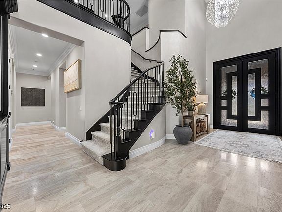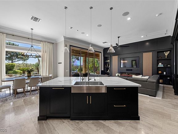 Experience luxurious desert living in this exceptional residence located on the 10th hole of the prestigious Anthem Country Club golf course. This one-of-a-kind property offers resort style living in a serene, guard-gated community. Oversized windows and sliding doors create seamless indoor-outdoor living. This home boasts a chef’s kitchen, fully equipped with high-end appliances, and quartz countertops and island. The living room is a true entertainer’s dream, with a custom bar featuring a temperature-controlled wine cellar and wall with optimal storage that leads to the custom private home theater room, perfect for hosting evenings and unwinding. The downstairs primary suite offers a spacious retreat, with designer upgrades, walk-in closet, and French doors with direct access to outdoor living space. Backyard oasis, featuring a sparkling pool with a cascading waterfall feature, a built-in BBQ, fireplace and a putting green - all with sweeping views of the fairway and mountains.