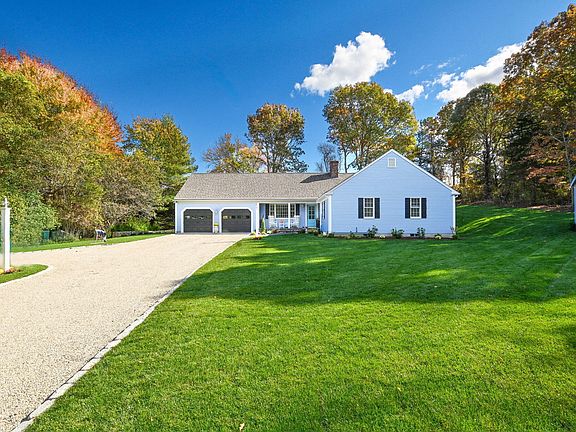 Sandwich Village Charmer! *See video drone* enclosed. Stroll to the Village to restaurants, taverns, shops and boutiques, library and Town Hall. Custom stone column pillared entry to this 1.33 acre cul-de-sac setting abutting 50 acre Crow Farm to rear. Cobblestone driveway leads to front stone porch. Enter into this totally renovated and reimagined Ranch style residence with custom appointments thru-out. Spacious primary ensuite with double vanity and walk in glass shower. Private egress to rear patio. Open floor plan with recessed lighting, crown moldings and satin wood floors. Living room with Fireplace leading to Kitchen with quartz counters and tile backsplash. Separate laundry room with Washer and Dryer. Dining room with slider to custom crafted stone patio overlooking expansive rear yard conducive for all backyard fun activities. Plenty of room for pool addition. 2 car attached garage. Full basement. Oil Heat, Central AC, Underground sprinkler system. Stone walls, Custom outbuilding.Professionally landscaped with numerous perennial and ornamental plantings.