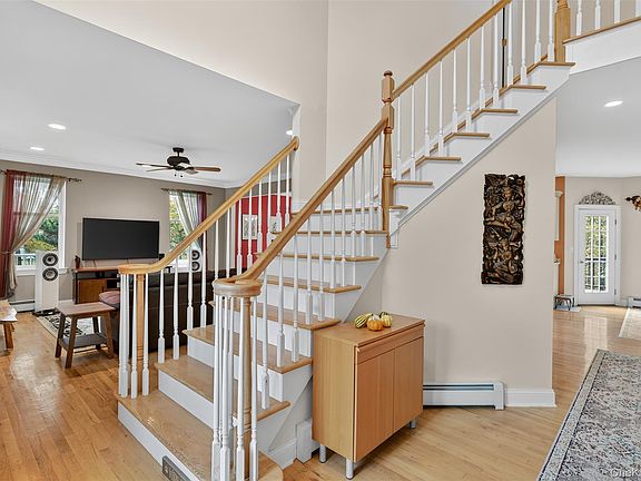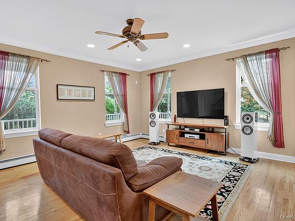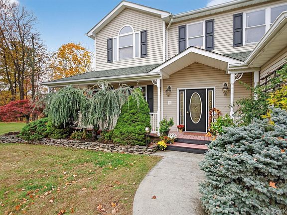 Welcome to Country Woods, one of Chester’s most sought-after neighborhoods. This handsome Colonial sits on 1.7 landscaped acres and offers over 3,100 square feet of comfortable living space. A wrap-around front porch invites you inside, where a two-story foyer and 9-foot ceilings create a bright and spacious feel. The formal living and dining rooms flow seamlessly into the kitchen, complete with Corian counters and everything you need to prepare your favorite meals. The casual dining area opens to a warm and inviting family room featuring a vaulted ceiling, fireplace, and a wall of windows framing peaceful views — the perfect spot to gather for movie or game night as you watch the snow falls outside. A first-floor bedroom offers flexible space for a home office, guest suite, or quiet meditation room. A conveniently located laundry room and half bath complete the main level. Upstairs, unwind in the primary bedroom suite, plus three additional bedrooms and a full hall bath. Need more space? The full walk-out basement provides endless possibilities — a home gym, game room, or recreation area — the choice is yours. Step outside to enjoy your own private retreat, ideal for entertaining, gardening, or simply relaxing on the oversized deck overlooking a tranquil Koi pond with waterfall and wooded backdrop. Conveniently located near major commuter routes, shopping, Woodbury Common Premium Outlets, schools, cafes, and restaurants — this home truly has it all. Call today to schedule your private tour and spend the holidays in your new home.