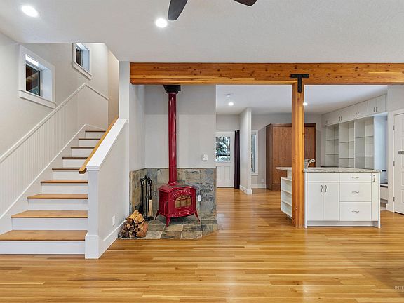 Beautiful custom cabin tucked in the forest with a year-round stream and multiple levels of living space—ideal for multi-family use, shared ownership, or hosting guests with privacy. The main level features quality woodwork, gorgeous wood floors, and a well-designed kitchen with custom soft-close cabinets, pull-out drawers, a prep-sink island, and leathered granite counters. A wrap-around T&G covered deck spans three sides for easy indoor-outdoor living. The walk-out basement has its own entrance and can function as a private apartment, with a new mini-split for added comfort. Additional features include radiant heat, a Vermont Castings wood stove, double-pane windows, water filtration with reverse osmosis, and a patio wired for a hot tub. The second level offers a private suite with its own deck, clawfoot tub, French doors, and mahogany barn doors. The top floor is flexible—perfect as a master suite, bunk room, studio, or media space. Two parcels provide added privacy, plus a fenced garden and RV shelter.
