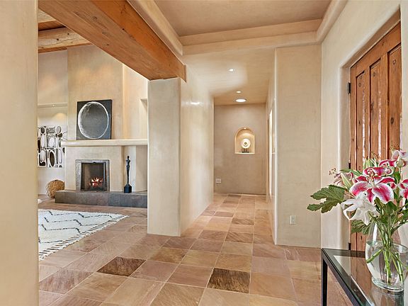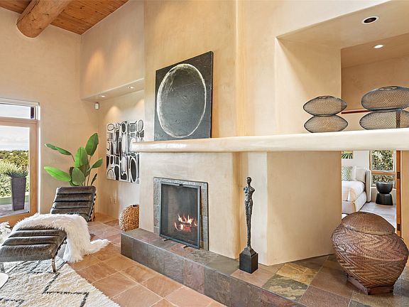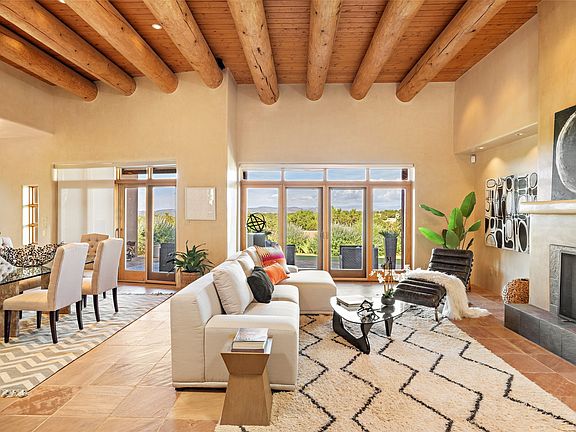 THIS LAS CAMPANAS SINGLE LEVEL HOME OPENS UP TO THE EXPANSIVE JEMEZ VIEWS AND WIDE-OPEN SKY OF SANTA FE! Welcome to the home of sweet dreams in Las Campanas, a prestigious gated community in Santa Fe, New Mexico. This stunning property offers unparalleled views of the Jemez Mountains and the surrounding natural beauty. Situated on a spacious 3-acre lot at the end of a sleepy cul-de-sac, this home is a peaceful oasis that invites you to relax and enjoy the serene lifestyle. This home features 3 bedrooms, a great office and 2.5 bathrooms. The interior design is a perfect blend of contemporary and traditional Santa Fe style, with high ceilings, vigas & beams, plaster walls, stone floors, fireplaces and skylights. The open floor plan allows for easy flow between the living room, dining room, and kitchen, creating a great space for entertaining or family gatherings. The gourmet kitchen is equipped with stainless steel appliances, granite countertops and a walk-in pantry. The master suite is a luxurious retreat with a fireplace, a walk-in closet and a spa-like bathroom with a soaking tub, a separate shower and dual sinks. The other two bedrooms are spacious and share a full bathroom. The outdoor living space is equally impressive, with a covered portal featuring a cozy seating area with a fireplace and an outdoor dining area that provides shade and comfort for the perfect indoor/outdoor lifestyle. The backyard is landscaped with native plants and trees that blend seamlessly with the natural surroundings. Walk for miles on the nearby trail system. From here, you can enjoy the spectacular views of the mountains and sunset. This home is truly a gem in Las Campanas, where members can enjoy the amenities of the private club - arranged separately and by invitation with the club - which offers 2 Jack Nicholus golf courses, the equestrian center, spa and tennis. Don't miss this opportunity to own this exquisite property that combines luxury, comfort and elegance.
