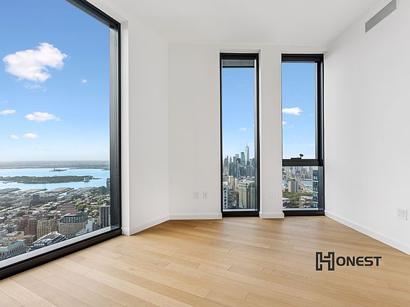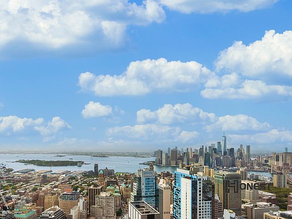 Residence 69B at The Brooklyn Tower comprises 700 square feet, offering one-bedroom, one-bathroom, and expansive views of the Statue of Liberty, Governor's Island, the Brooklyn Bridge, and Lower Manhattan.