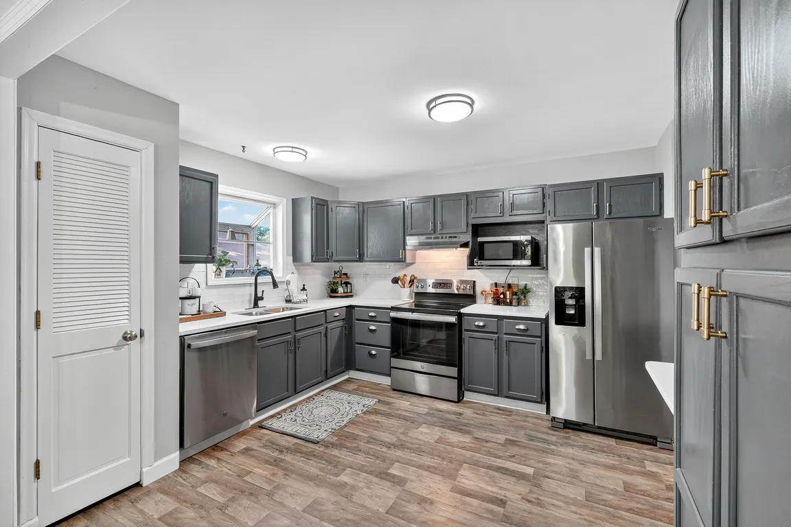 Peaceful backdropRear patioQuartz countertopsUpdated bathroomOversized closetStainless steel appliancesCustom tile backsplash