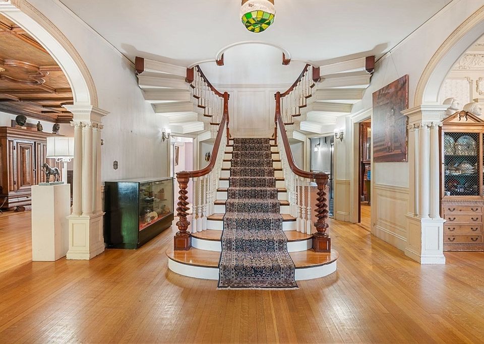 Spectacular 5800 SqFt Colonial Revival c. 1907 with unbelievable original detail throughout, built for Leonard Rhodes, a Brookline greengrocer. Grand Foyer with Princess staircase, powder room; front to back formal living room with beamed ceiling, bow windows, fireplace w/carved maple mantel and Grueby Arts & Crafts hand-painted tile frieze. Wood panelled sunroom w stone fpl & stained glass; dining room w fireplace & pocket doors to family rm w/ tapestry wall paper w/woodland scenes, ornate ceiling lighting, fpl. Eat-in kitchen with great layout includes pantry w/laundry. On the 2nd floor, 4 bdrms and 3+ baths include a front to back primary suite, plus a sitting room. 4 additional bedrooms, cedar/storage walk-in closets, and a billiard room with a hand painted mural on the 3rd. Natural woodwork, ample closets/built-ins. 14+ room, 8BRs on a large corner lot. Close to shopping, schools, 2 MBTA lines. Sellers welcome offers with requests for buyer concessions