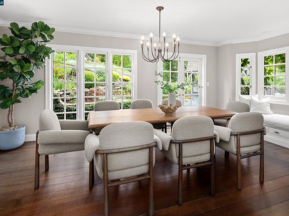 This Tudor-style home, near the end of a quiet cul-de-sac adjacent to the Orinda Country Club, offers tranquility and luxury. Surrounded by manicured gardens, the home includes a living room with a wood-burning fireplace, distinctive oak hardwoods, and garden views on three sides. The formal dining room easily seats 10. The chef’s kitchen offers elegant counters, Viking and other elite appliances, and a breakfast nook with a wood-burning fireplace. The principal suite, just steps above the main level, features an oversized shower, freestanding tub, and dual closets. The other main-floor bedroom equally could be reconfigured as a large and elegant office. Upstairs, two additional bedrooms (each with its own bathroom) are connected by a family/play room with a built-in work station. The sun-splashed bluestone patio outside leads to a remarkable outdoor pavilion, assuring the best of indoor-outdoor living with a Wolf grill, fireplace, spacious dining area, refrigerator, and dishwasher. The patio leads to a hillside ADU/studio. Other features include a home gym, a laundry room with LG appliances, and ample storage. With its blend of architectural charm, thoughtful modern updates, and a gorgeous garden setting, this private sanctuary is ready to welcome its next fortunate owner.