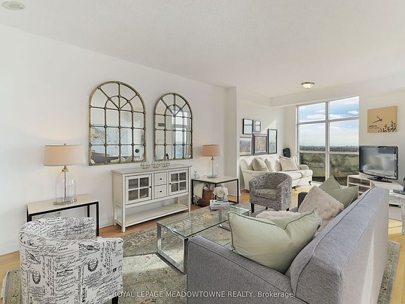 Experience luxurious penthouse living in The Renaissance-one of Brampton's most prestigious addresses. This one-of-a-kind "Ungaro" corner suite offers an expansive 1,667 sq. ft. of refined living space and panoramic views spanning the entire GTA, visible through floor-to-ceiling windows in every room. Designed for both comfort and sophistication, the open-concept kitchen features granite countertops, stainless steel appliances, a large island, and elegant finishes perfect for entertaining. The spacious living and dining areas flow seamlessly, leading to two private terraces-ideal for enjoying morning coffee or evening sunsets high above the city. The grand primary bedroom is a true retreat, boasting a 4-piece ensuite, an upgraded walk-in closet, and direct access to its own terrace. Two additional bedrooms and a versatile den provide ample space for family, guests, or a home office. Additional highlights include 2 full bathrooms, 2 premium parking spaces, and 2 lockers for ultimate convenience. Hardwood floors throughout the main living areas elevate the space, while the rare layout and abundance of natural light make this penthouse truly exceptional. Located in the heart of Brampton's vibrant downtown, The Renaissance offers upscale amenities and a prime location just steps from dining, shopping, transit, and the arts. This exclusive 1-of-1 penthouse redefines luxury condo living-a must-see for those who want the best of city life with unmatched elegance and views. Great amenities such as Concierge, Party Room, Guest Suites, Media Room, Meeting Room, Parking Garage, Sauna, Indoor Pool, Bike Storage, Gym, Security System.