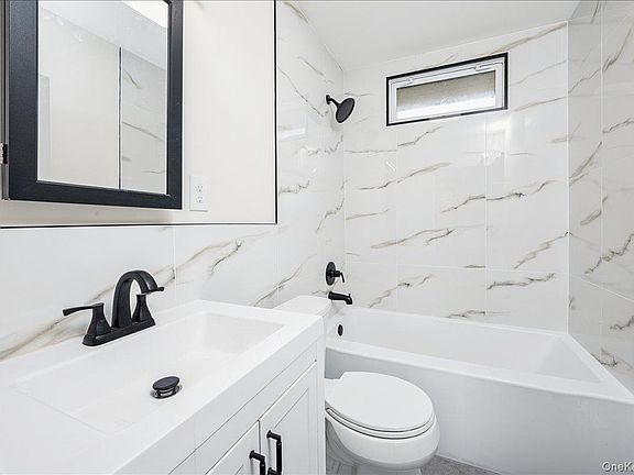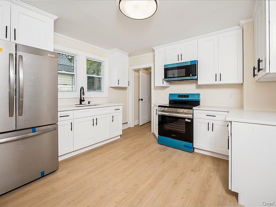 Step inside to a bright, open kitchen featuring new white shaker cabinets, quartz-style counters, sleek black hardware, stainless steel appliances, and laminate flooring that flows seamlessly throughout. The bathroom showcases elegant tile work, modern fixtures, and a fresh, spa-like feel.
