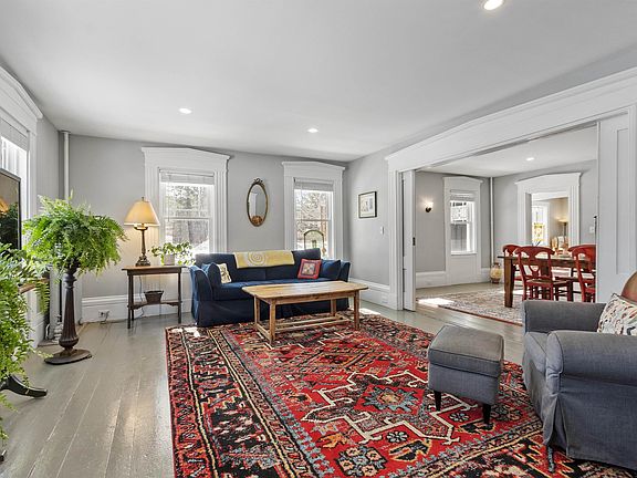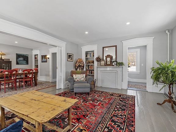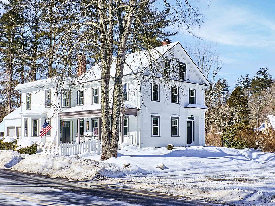 This versatile, antique farmhouse at the intersections of Routes 101 & 31 has been tastefully updated inside and out. Three floors with 2886 sq. ft. of living space. Plenty of closets and storage throughout. The inside charms you with wood floors, built-ins, beautiful moldings, a new kitchen, and renovated baths. On the first floor, a large kitchen with hickory cabinets, quartz counters, stainless appliances, and an extra-large pantry is a cook’s dream. Off the kitchen is a sunny sitting room with a wood stove and maple floors. The dining room is adjacent to the front living room that can be divided into separate spaces by the original 8-foot solid wood pocket doors. The first floor also boasts a full bath and a mudroom with attached cold storage. Upstairs has a 2nd floor laundry, 3 big bedrooms and 2 full baths. The large main bath has a double vanity, a soaking tub, and a 5-foot walk-in shower. The 3rd floor has two rooms which would be great as an office or hobby space. Updates include new roof, electrical and plumbing, insulated prairie style windows, furnace, hot water heater, oil tank, new foam insulation and a new septic tank. This house sits on a half-acre lot with a cottage garden and has an attached two-car garage, a large garden shed, wood shed and space to store yard equipment. Zoned for residential and business, this property offers many possibilities with plenty of parking.