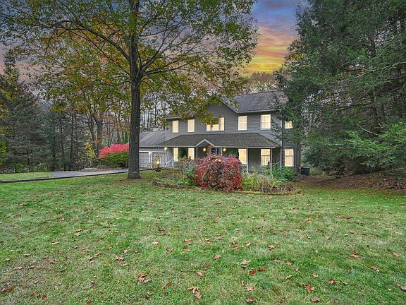 FALL in love with 9 Greenwoods, a charming 4 bedroom colonial in the bucolic town of North Granby, CT! Situated on 2.7 private acres in a sought-after cul-de-sac of upscale homes, this country retreat offers tranquility & convenience. As you approach, you'll immediately notice the inviting front porch & cozy patio w/ a fire pit, perfect for relaxing & entertaining guests. Step inside to be greeted by a sun-filled two-story foyer with an elegant staircase and abundant windows. The spacious formal living room features thick crown molding & a bay window, ideal for quiet moments or enjoying music. The formal dining room has ample space for a buffet & hutch. The generous sized country kitchen features tall grey wooden cabinetry, a butcher block island, desk, arched window & it opens to an eat-in area & family room. The family room boasts a wood-burning fireplace, a coffered wood ceiling & French doors leading to a serene screened porch. A mudroom off the kitchen leads to the powder room, laundry & two-car garage, w/ an additional 3rd bay at the rear. The primary bedroom has 2 walk-in closets! The large walk-out lower level offers a 5th bed/office, 3rd full bath, recreation & gym space. Nearly every room in this home has plantation shutters, smooth ceilings & new carpet. Enjoy nearby Lost Acres Vineyard, Enders Falls, McLean Game Refuge, Old Mill Pond Village Shops & restaurants in downtown Granby. Convenient to Bradley International Airport. Make it your home for the 2025 holidays The lower level was finished by the previous owner and is not on the town card. Even though it has no heat or AC, the sellers said that is stays pretty comfortable year round.