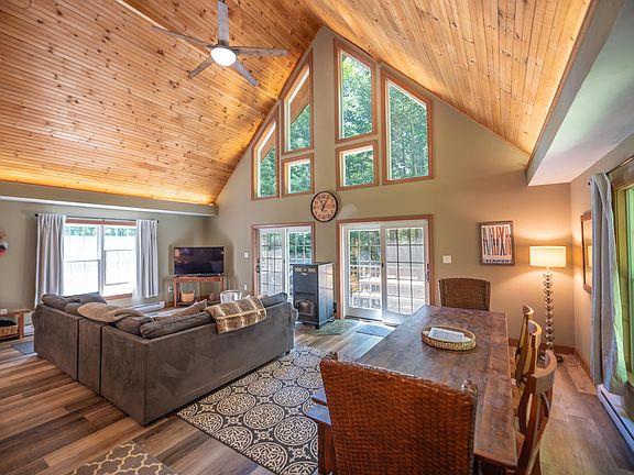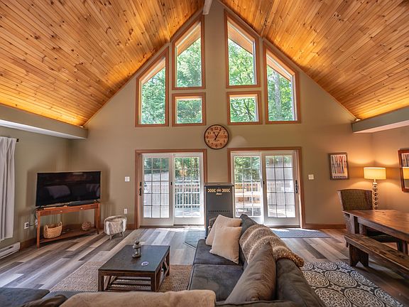 Charming 2007 home with recent renovations nestled in the Chimney Hill community just a short drive from the Mount Snow ski resort, country village of Wilmington, and nearby lakes and amenities. This home sits on a private dead end parcel and has unique privacy and curb appeal. Inside you are treated to a large vaulted great room with expansive windows, exposed natural wood ceilings, and great natural light as well as complimentary up lighting, a highly efficient pellet burning stove, an open concept living area with spacious dining area and upscale kitchen with granite counters, stainless appliances, and kitchen island, a large main floor primary bedroom suite with soaking tub, an additional guest bedroom and full guest bath on the main floor, large loft den with sofa and tv, overlooking the great room, as well as second primary suite with full bath. Additionally, there is a huge unfinished walkout basement that would afford tremendous expansion potential where you could add additional living and overflow sleeping space. This is complimented by the amazing Chimney Hill amenities including club house with indoor and outdoor pools, hot tub, gym, locker rooms, game room, theater, playground, basketball and tennis courts, winter ice skating, and on site management company offering additional a la carte services for downtime, not upkeep.