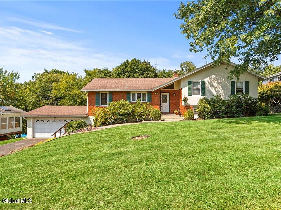 Perfectly situated in East Greenbush, this home offers a country-like feel while being just minutes from shopping, restaurants, the town park, easy access to Albany and just steps away from the rail trail! This 3-bedroom, 2-bathroom split-level home has so much to offer. The bright and spacious kitchen features a dining area and a breakfast bar that opens to an attached sunroom. The living room has beautiful hardwood floors and French doors that lead out to a spacious deck and a large tree-lined backyard. Upstairs, you'll find three bedrooms and a full bathroom. The lower level is versatile and could be converted into an in-law suite with a full bathroom nearby. The basement includes a washer/dryer, plenty of storage space, and direct access to the 2-car garage. East Greenbush Schools!