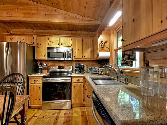 Nestled in the peaceful wooded setting of Cherry Log, this charming, cozy cabin offers the perfect retreat for nature lovers and those seeking tranquility. With its warm, rustic interior featuring all wood interior, a stone fireplace, and soft ambient lighting, the cabin exudes a welcoming, homely atmosphere. The open-concept living area connects seamlessly with a fully equipped kitchen with granite and stainless appliances, making it easy to relax and unwind after a day of exploring. The primary suite is a luxurious haven designed for comfort with high volume ceilings, large windows and 2 closets. Outside, a spacious and expansive deck overlooks the surrounding forest, providing the ideal spot for morning coffee or evening stargazing and features stepless entries and 1- car detached garage. Whether it's for a weekend getaway or a longer stay, this cabin promises comfort, serenity, and a true connection to nature.