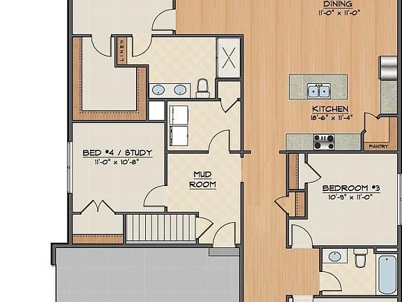 The Dogwood is a spacious 4BR ranch plan. BR4 is perfectly suited for a home office, providing a quiet and private space for work-from-home needs. The heart of this home is its kitchen, which includes a large corner pantry, ideal for storing all your essentials. Off the dining area, is a covered porch inviting you to enjoy meals outdoors or just relax while taking in the fresh air.