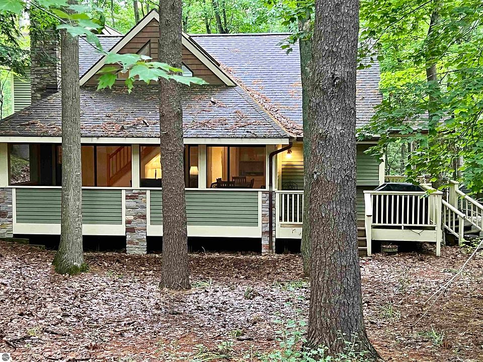 Adorable and spacious, this updated home rests in the heart of The Homestead Resort between the picturesque beaches and ski hills and is surrounded by serene woodlands. With 5 bedrooms and 3 full bathrooms the home is spacious, yet cozy and offers 2 separate upper level "wings" (not to mention a large main floor master suite). The open concept kitchen-living-dining area would be wonderful for entertaining year round, especially with the charming wood burning fireplace. The screened in porch invites you to read a book with coffee, enjoy a glass of wine in the evening or to play a game of cards with friends or family. The gentle sloping walk to the beach takes just 10 minutes! This property has been used partially as a rental and partially for family use and is being sold furnished/turn-key with some personal exceptions.