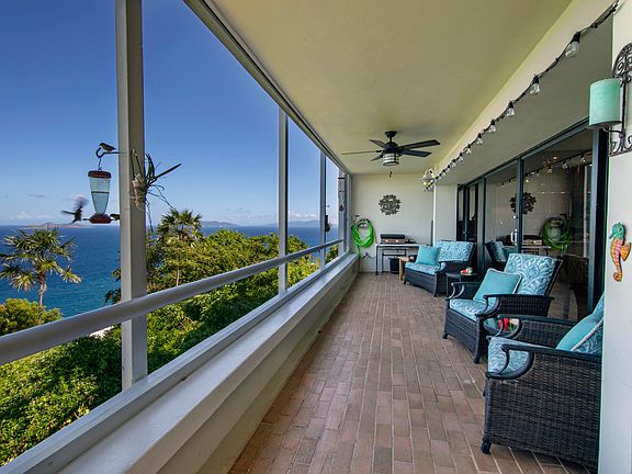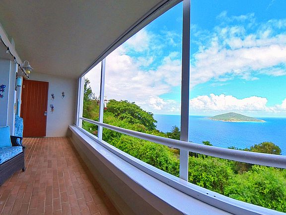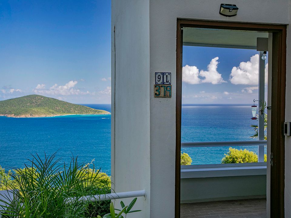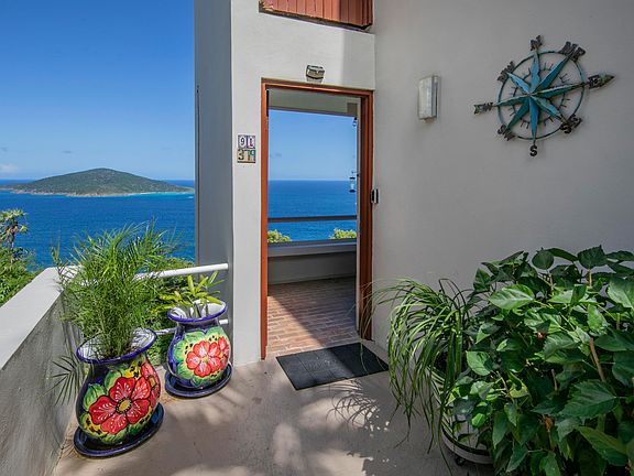 Villa Collina, is a 1 bedroom, 1.5 bath condo offering panoramic and unobstructed views from Hans Lollick to the BVI framed by beautiful, tropical vegetation. Located in the gated Mahogany Run Community, the condo features a 32' covered balcony, your outdoor living/dining 'room' and finely crafted custom mahogany cabinetry throughout. The expanded master bedroom has two built in desks and the spa-like bath has a double sink vanity and contemporary walk-in shower with a beautiful ocean vista. A rare half bath makes this the only one bedroom of its kind in the complex. Upgrades include a new, shared 30KW diesel generator, storm shutters, and Starlink mount. Private and exceptionally well maintained, Villa Collina is island living at its best