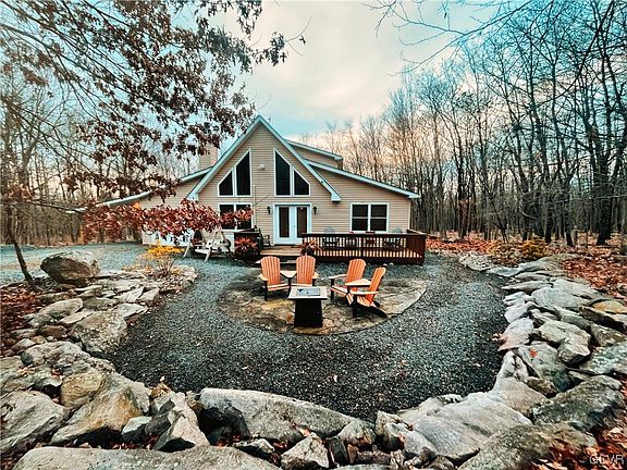 The holidays have come early with this listing! This home is a true mountain retreat, an escape from the everyday and a chance to relax and unwind in the woods. Located just off the turnpike, minutes from everything, yet free from the hustle and bustle of the growing Pocono area, this house checks ALL of the boxes. Sought-after chalet style home with 3 beds, 2 baths, cathedral ceilings, sunroom, and screened in porch. Nestled on a quiet street, this corner lot property is being sold with two additional parcels for a total of 3.58 acres! Outside entertainment possibilities abound, as this home offers multiple decks, a hot tub, hammock, two fire pits, winding river rock gardens, and unique and natural landscaping! There is even an outdoor shower! Don't delay! (More photos coming soon)