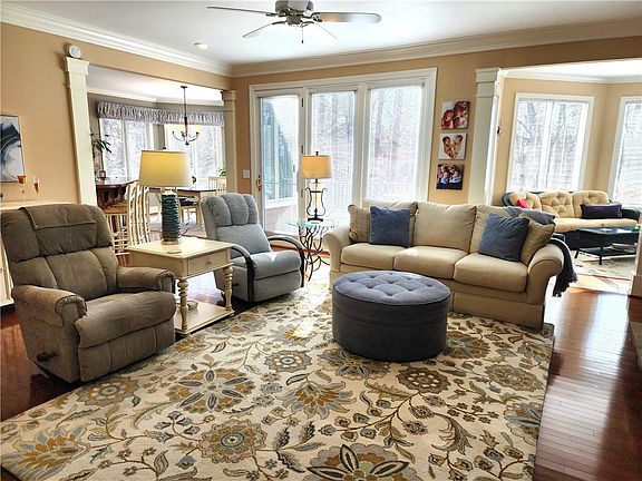 In addition to a living room and separate dining room, you will find an office that could be a 4th bedroom if needed, a sunroom with windows also looking out to the seasonal lake view, a large eat-in kitchen with granite counters, stainless appliances, and gorgeous views as well. The laundry room with washer and dryer new in 2021, and large walk-in pantry are located just off the kitchen. The master has a large walk-in closet and recently remodeled bath with walk-in shower and soaking tub. Two additional bedrooms and a guest bath complete the rooms in the house. The home has crown molding throughout, gleaming wood floors in the main living areas, and has been painted inside and out. Other notable features include a fully encapsulated crawlspace with dehumidifier, deck replaced in 2018, floored attic with pull down stairs for easy access to storage, an inground irrigation system; storage racks, 2nd refrigerator and a workbench in the garage. HVAC was replaced in 2018.