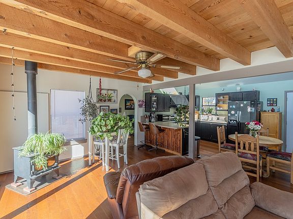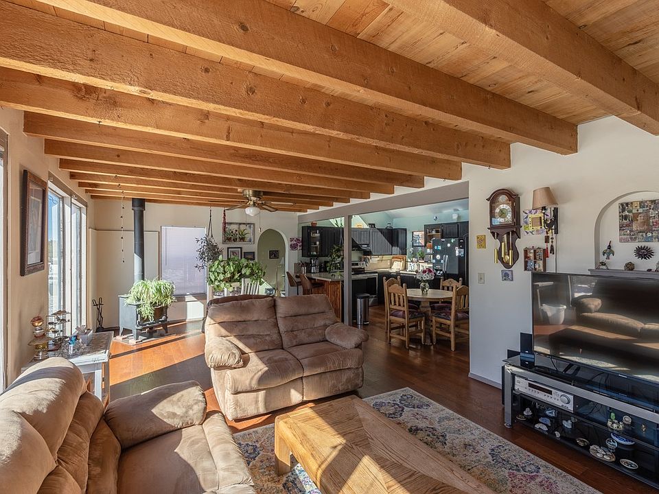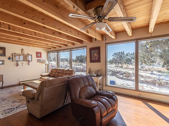 This charming, well maintained, 2 bedroom, 2 bathroom, 2 car garage, single family home is situated on 1.58 acres that backs to a greenbelt and is located on a quiet road in the Eldorado community. This home includes an office which could be converted into a third bedroom. The kitchen is bright and sunny with clerestory windows, stainless steel appliances and quartz countertops. This home feels spacious with an open floor plan that includes rough sawn beams in the dining and living areas as well as a wood burning stove. The serene backyard includes a portal with stamped concrete and views of the Sangre de Cristo mountains. A new hot water heater was installed February 2019, and stucco was done in 2017. The HOA fees includes many amenities like use of the community center, athletic fields, pool and also a dog park, just to name a few. If peace, quiet charm and natural preserve are on your wish list, this gem is a must see.