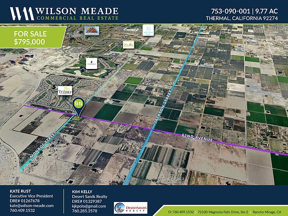 Looking for a clean, well located, income producing, organic date farm that's not enormous? Here it is; Alexandra Dates, featuring approx. 374 producing Medjools, and approx. 118 shoots. Fenced, and irrigated with a reservoir filled with CVWD No MHSCP, No Williamson Act, Sewer in Monroe Street and electric to site. (Buyer to verify) Zoned A1-10. A straight drive East on Avenue 62 to the Thermal Club, HITS showgrounds, and Jacqueline Cochran airport. Head directly North to Trilogy, The Palms, Eldorado Polo Club, Music Festival grounds and central La Quinta. Beautiful farm, great location, P & L's available upon request.